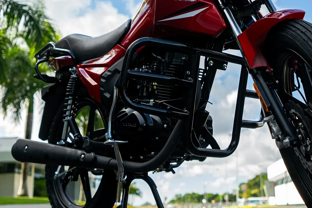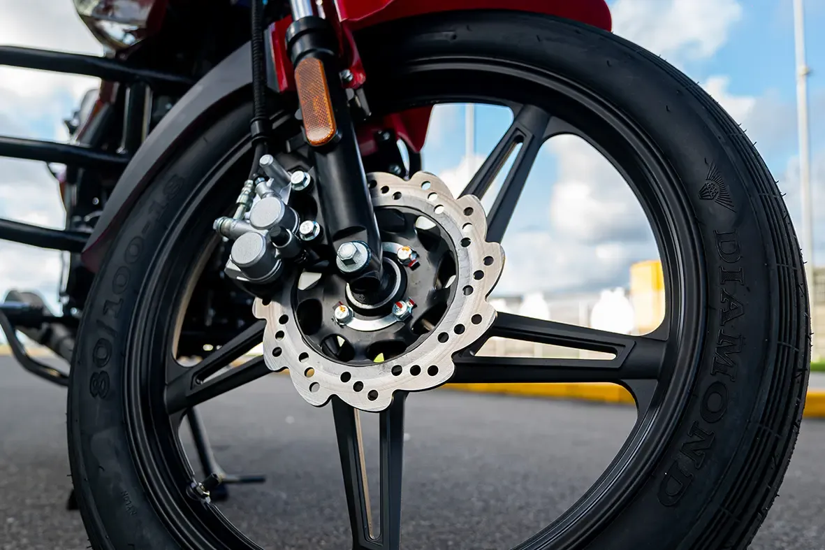 A FREE 150 possui rodas de liga leve, oferecendo mais resistência e leveza, na roda dianteira e traseira conta com aro 18´´. O freio dianteiro é à disco, garantindo uma frenagem mais rápida e segura.