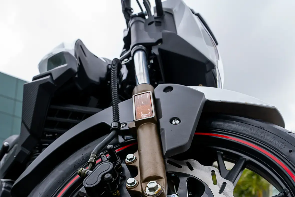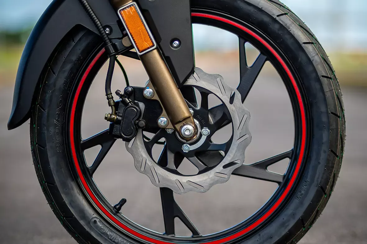 A JEF 150s conta com rodas de liga leve aro 17”, garantindo mais estabilidade e aderência ao solo, ideal para diferentes tipos de terreno. Além disso, conta com o freio dianteiro à disco, oferecendo uma frenagem mais eficiente e rápida.